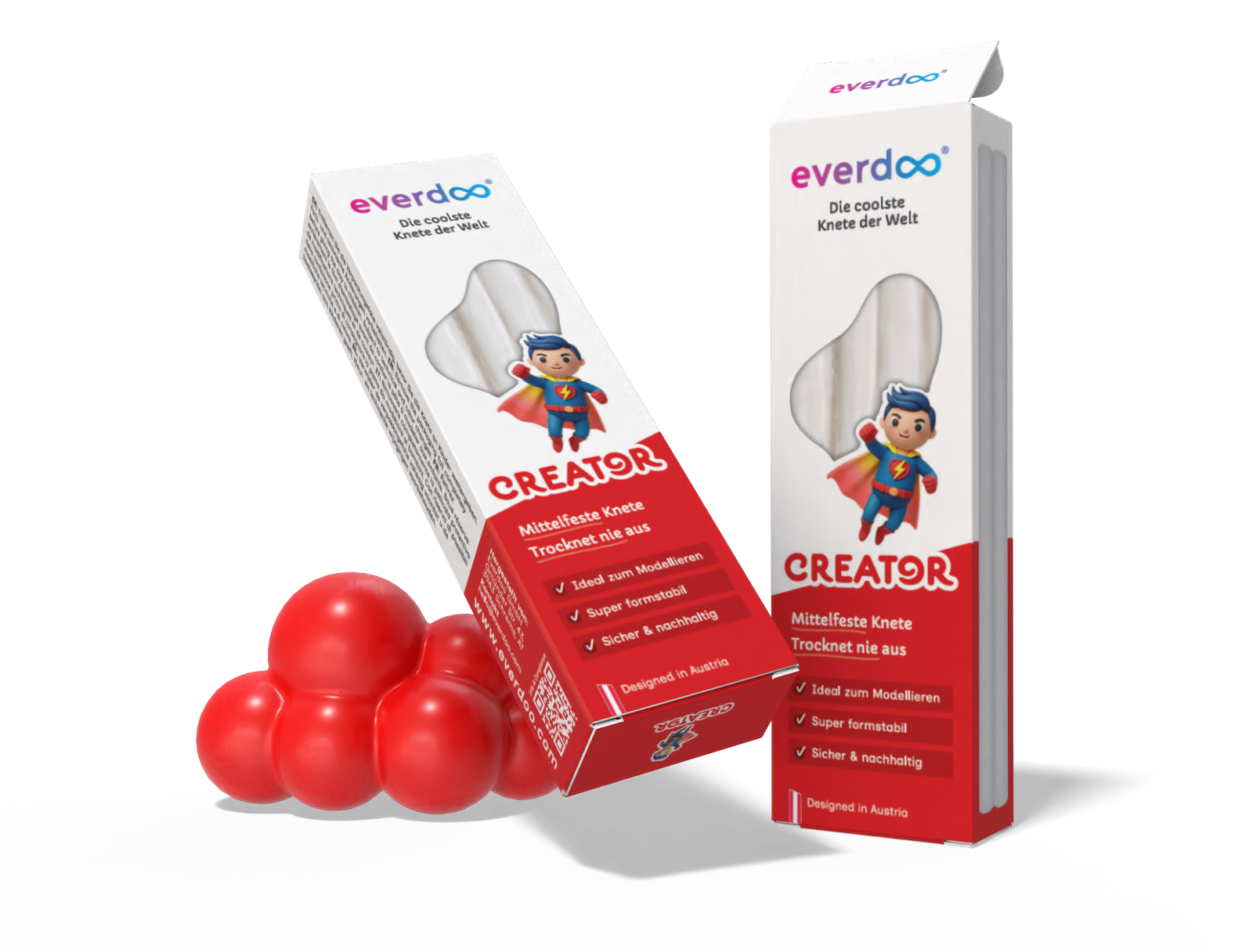 Die Creator-Knete von Everdoo wird aus 100% nachhaltigen und sicheren Rohstoffen hergestellt. Ihre besondere Formstabilität in Kombination mit der Möglichkeit, feine Details zu modellieren, fördert Kreativität, Konzentration und Präzision – und macht sie zu einem unverzichtbaren Produkt für Kinder, Jugendliche und Erwachsene gleichermaßen.